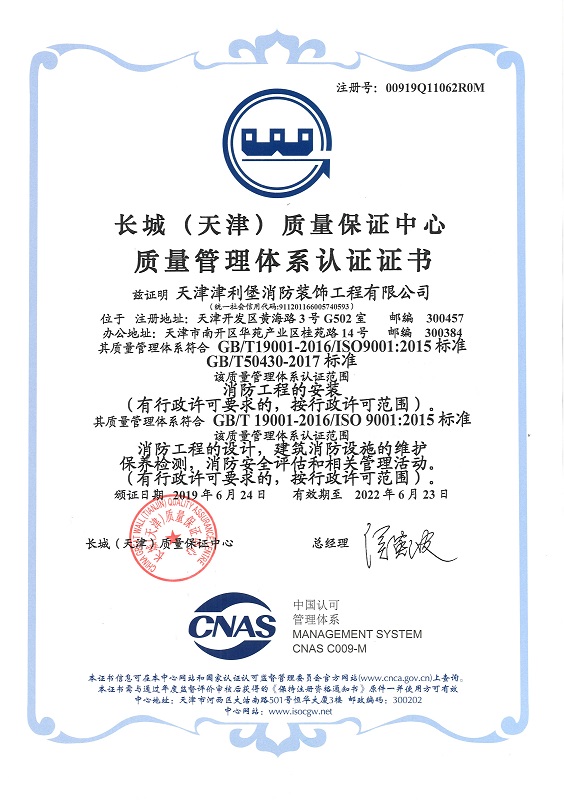 津利堡公司于200004月通過了適用于消防工程的設計、安裝及服務的質量管理體系認證(GB/T19001 idt ISO9001)。為適應市場的發展,促進公司在職業健康安全和環境方面管理水平的提高,進一步增強公司的市場競爭能力,津利堡公司于2004年09月通過了職業健康安全和環境管理體系認證(GB/T28001 idt OHSAS18001和 GB/T24001 idt ISO14001)。隨著公司的發展,并為了適應市場的要求,公司于2012年開始依據《工程建設施工企業質量管理規范》(GB/T50430)的要求重新整合公司的質量、職業健康安全和環境一體化管理體系,將“顧客的需求”、“以人為本、保護員工健康安全”、“節能降耗、保護環境”作為公司關注的焦點,以“共創安全、共享發展”為公司宗旨,注重員工在質量、職業健康安全和環境方面的素質和意識的培養,進一步提高了公司的一體化管理水平。